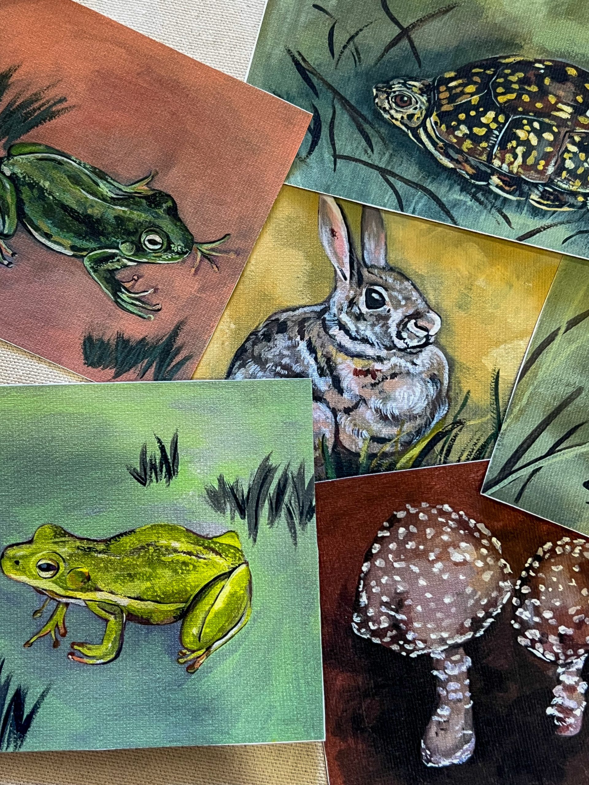When I first became a mom, I wanted my baby’s nursery to feel like a storybook with all sorts of whimsical woodland creatures—full of charm and wonder. That’s where these acrylic animals came to life: a sweet bunny living in our side yard, a wild wolf nestled in the woods, a gentle turtle taking its time in our garden, a cheerful frog hopping along, busy honey bees, a delicate butterfly, and even a quirky mushroom print to ground it all in earthy magic. Each woodland creature is hand-painted in a whimsical, yet earthy style with acrylics, using a color palette of soft greens, warm browns, muted mauves and golden hues that echo the forest’s embrace. The color scheme is designed to create a cozy, timeless vibe, perfect for a kid’s outdoor-themed room or even a family art display.